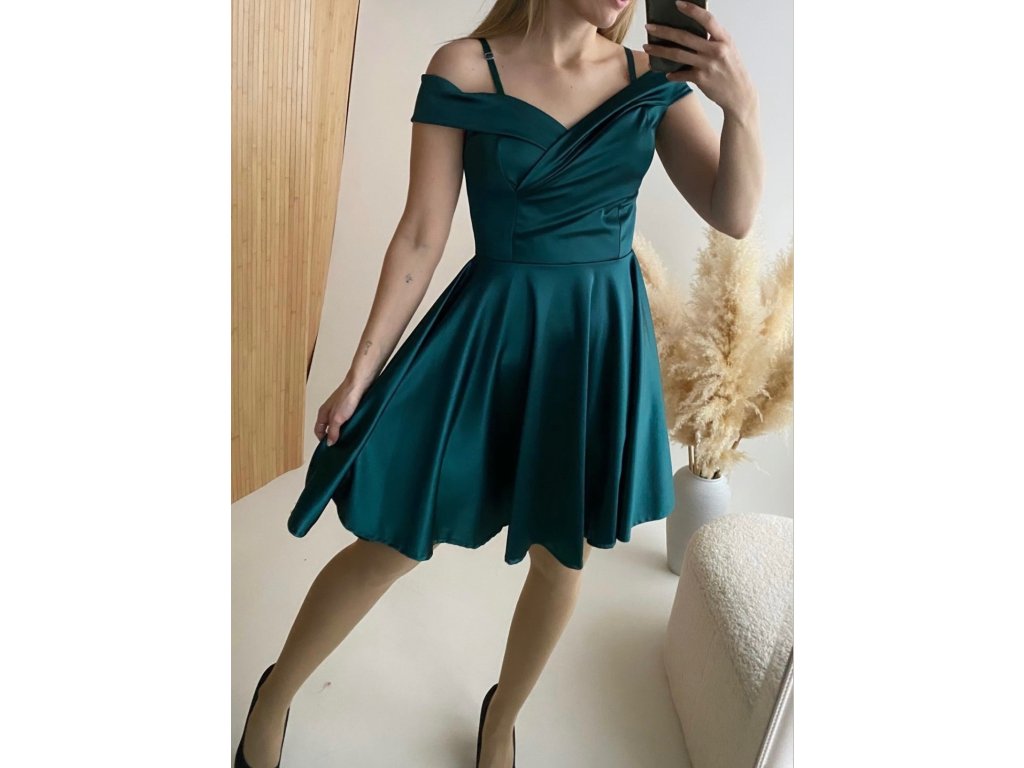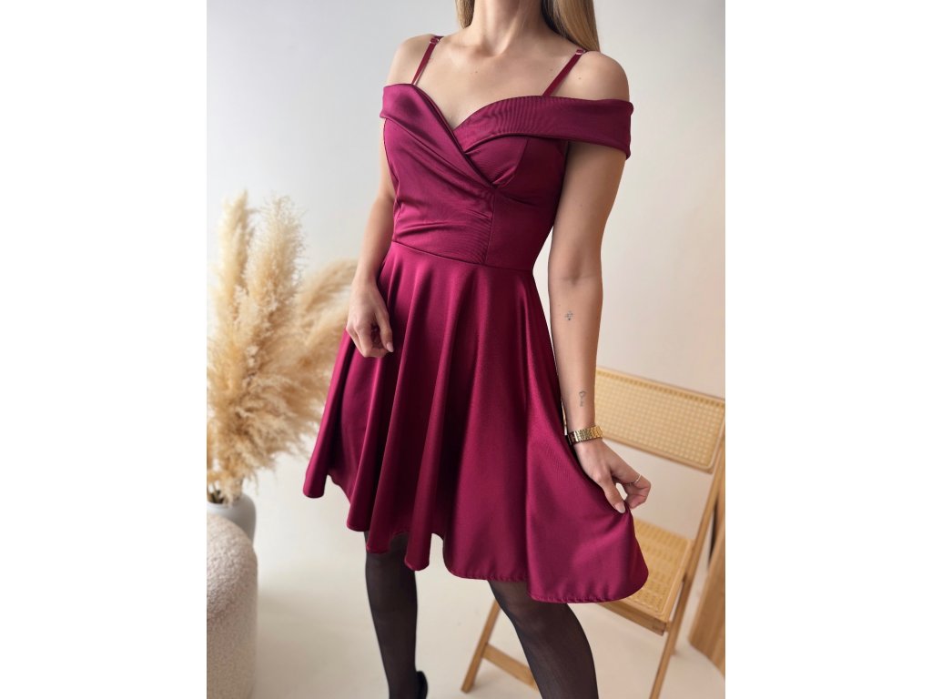 Krátké společenské šaty z lesklého, saténového materiálu.