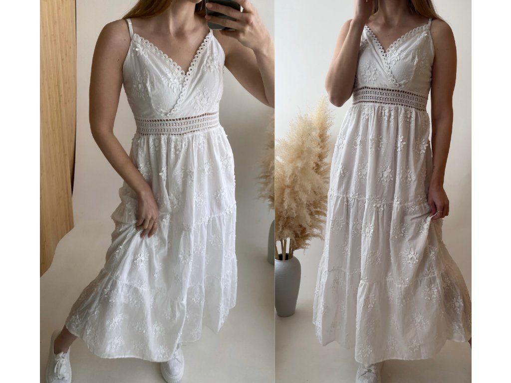 Romantické bílé šaty z jemné vyšívané látky.