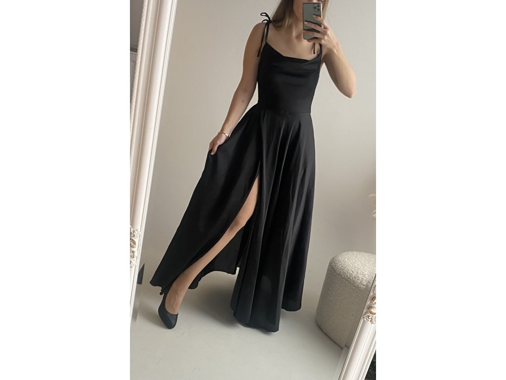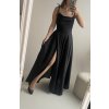 Šaty obohacuje rozparek a spadlý střih šatů na dekoltu.
